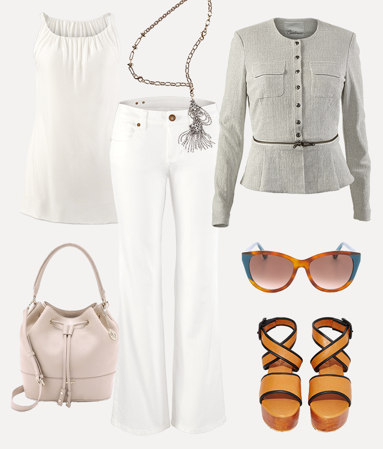 Zip Line Blazer, Fifth Avenue Tee, White Wide Leg Jean, DKNY Bag, Wink Necklace, Thierry Lasry Sunglasses, Shakuhachi Asuri Shoes