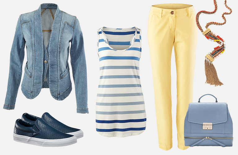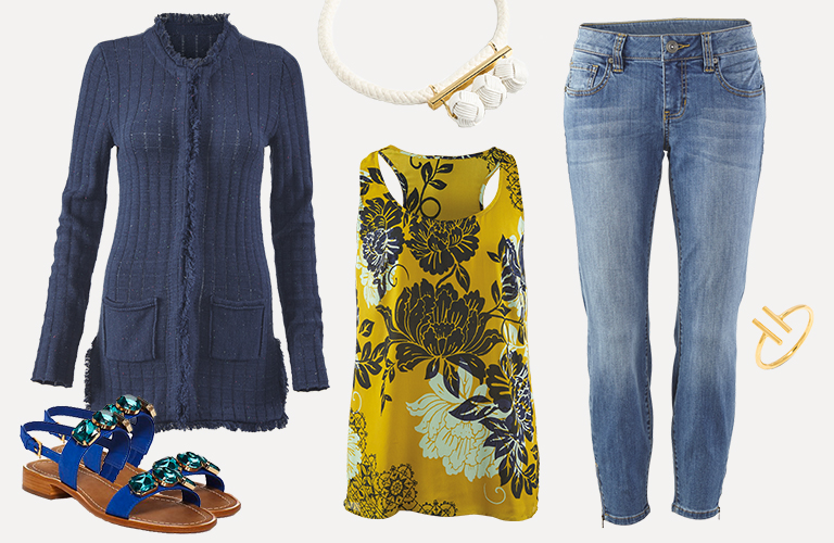 Spring’s forecast? Clear blue skies with lots of sun! Whether you’re color shy or color-full, CAbi’s Spring Color Guide will liven up your wardrobe with glorious shades of yellow and vibrant hues of blue. These brilliant colors happen to be complements on the color wheel, but we love them most for the way they complement our favorite spring staples. Read on for inspiration on how to wear this sunny color combo!