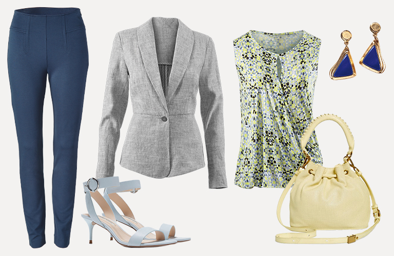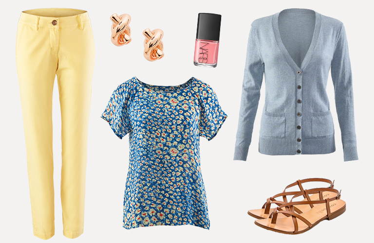 Wear the season’s colors with a feminine print top and colorful accessories.