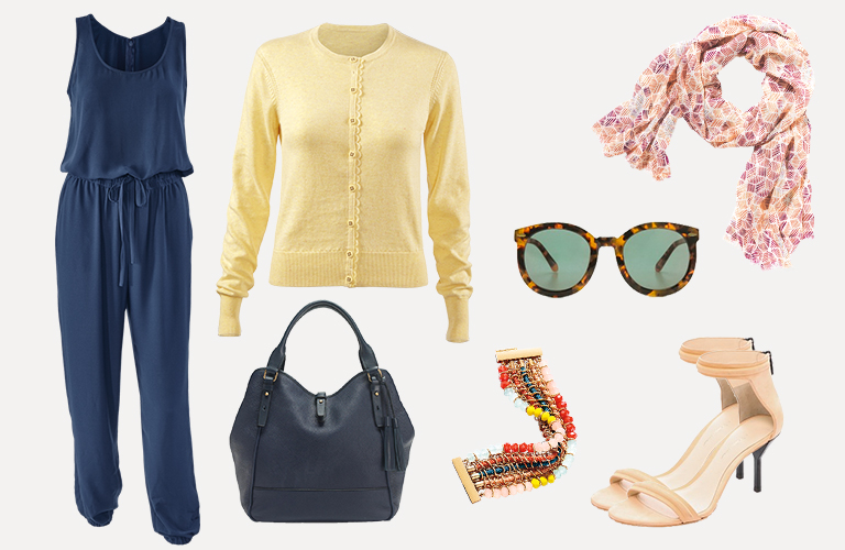 French Navy Jumpsuit, Sunny Cardigan, True Colors Tassel Necklace (as bracelet), Candy Print Scarf, JCrew Bag, Karen Walker Sunglasses, Phillip Lim Shoes