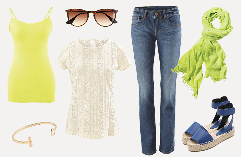 Simple Cami (Lemon Lime), Lace Tee, Laguna Wash Slim Boyfriend, Pop Scarf, Jcrew Bracelet, Ray Ban Sunglasses, Vince Shoes