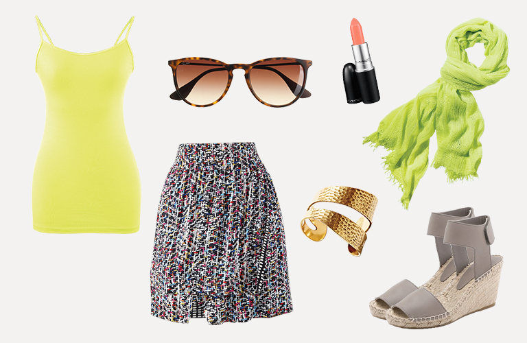 Simple Cami (Lemon Lime), Reversible Wrap Skirt, Hammered Cuff, Pop Scarf, Ray Ban Sunglasses, MAC Lipstick, Vince Shoes