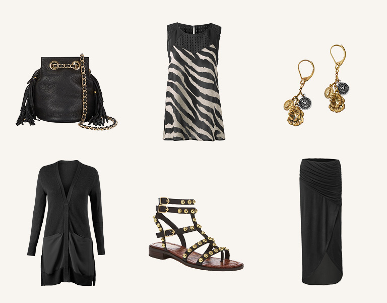 Sam Edelman Gladiator Sandals, Rebecca Minkoff Fringe Bucket Bag, Dolce Charm Earrings, Run Around Skirt, Tivoli Top, Sorrento Cardigan