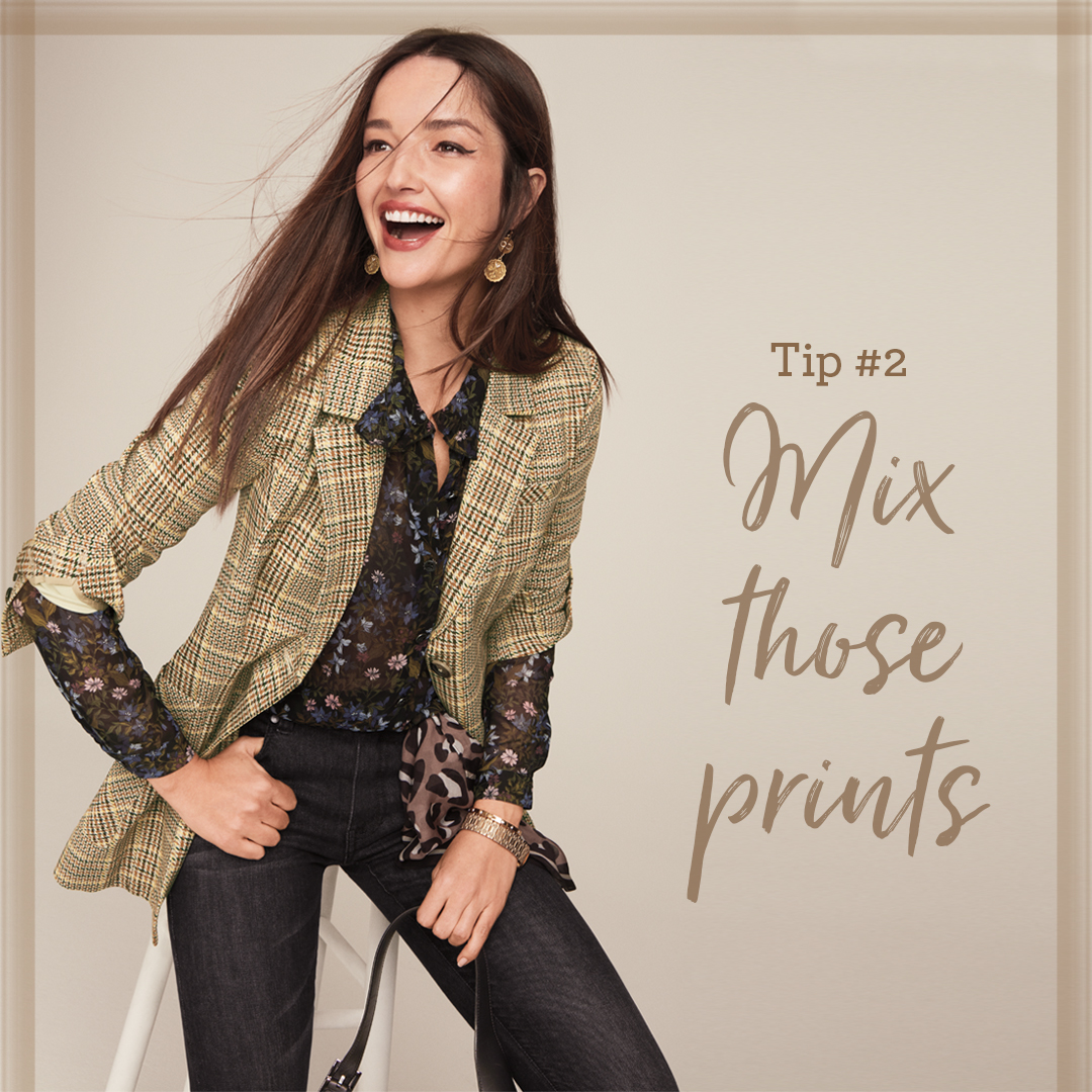 A quirky mix of prints speaks to a more boho vibe. Elevate this look by wearing sleek black tights under luxurious over-the-knee boots—our new fall uniform!