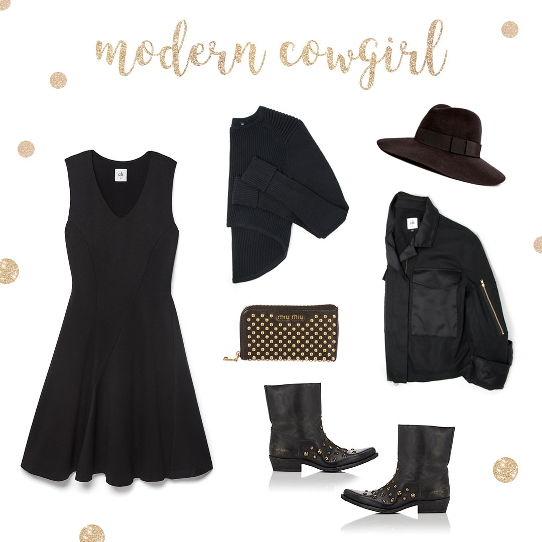 Featured Items: Performance Dress, Prep Pullover, Back in Black Jacket, Studded Cowboy Boots, Hat, Pouch