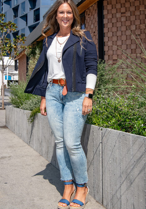 Rachel’s Look: Chance Jacket, Center Sweatshirt, Cinch Skinny, Lock & Key Necklace, Safari Belt, Parker Wedge