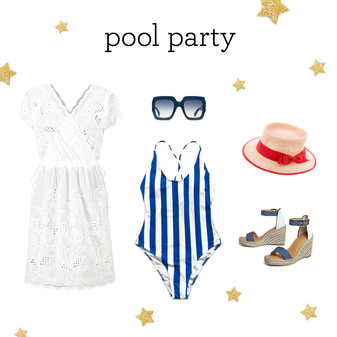 Nothing gets you in the spirit for Independence Day like a pool party and grill out! Dive into the holiday in a blue and white striped one-piece paired with a red accent hat. Our Eyelet Cover-Up is the perfect transitional piece. Wear it over your suit when you arrive, then once the evening hits, wear it as a dress! (Pack a plastic bag for your wet swimsuit, your purse will thank you.)