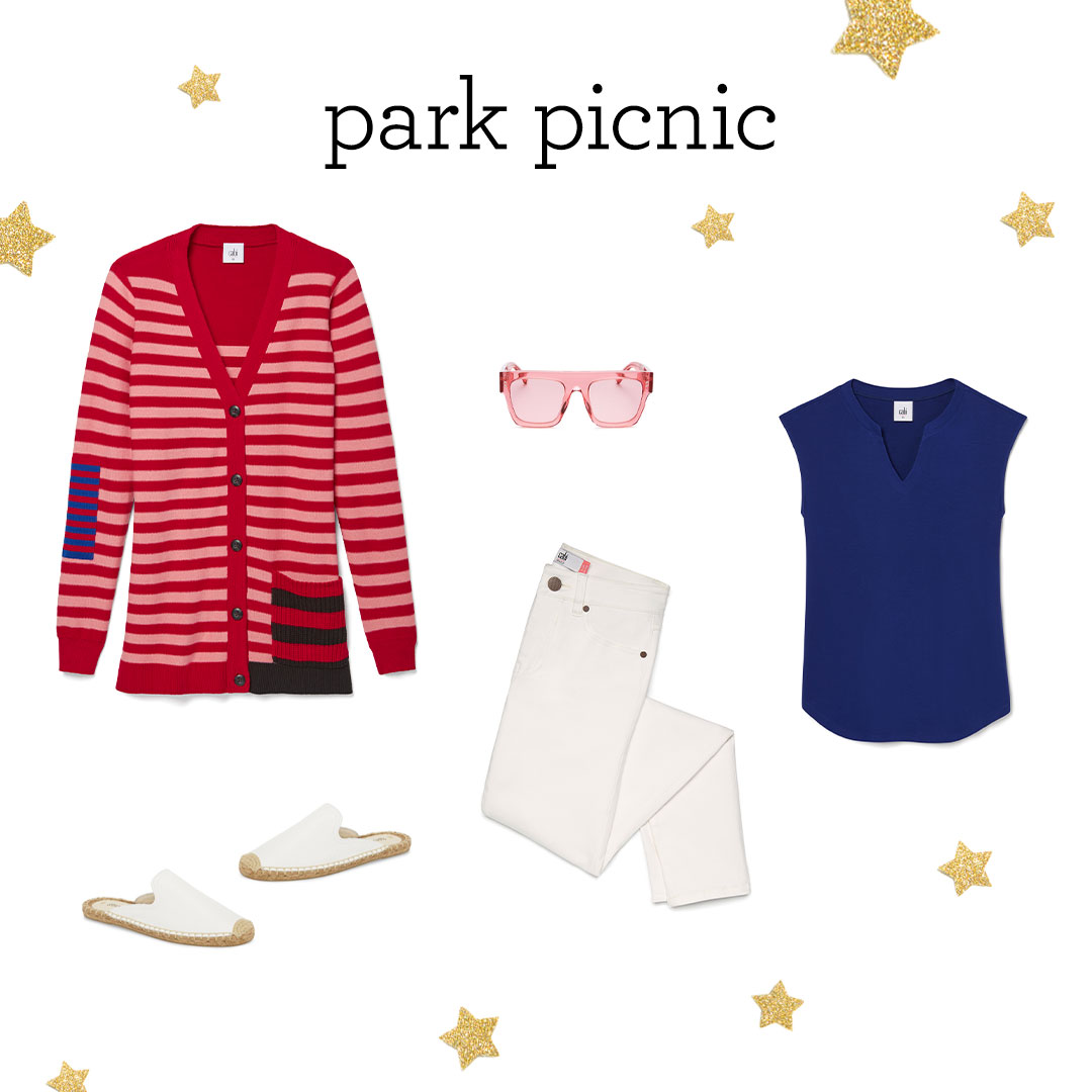 Our red striped Picnic Cardigan features the perfect touch of royal blue for easy pairing. Try this topper with a solid blue tee and white denim. A slip-on is the perfect footwear for a picnic—kick them off and relax! We love this look with some “La Vie En Rose” sunnies. To avoid grass stains, don’t forget to pack a durable blanket.