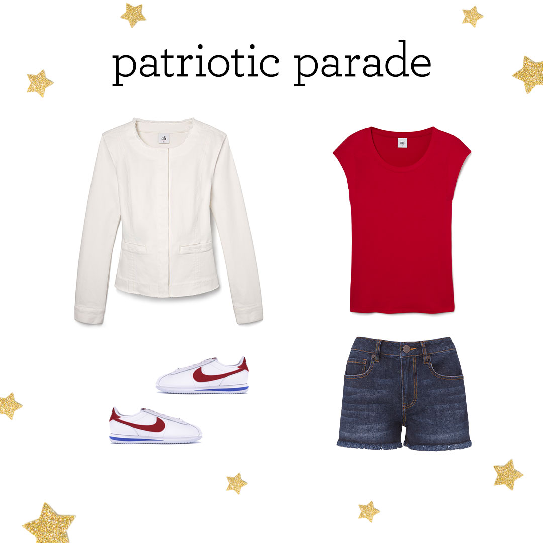 If you’re looking for a full-out patriotic ensemble, go with solid colors. Pair a navy denim short with a red tee and white jacket. Easy as one, two, three! We’re obsessed with the Nike Classic Cortez sneaker in red, white, and blue to tie all the colors back together. Don’t forget a hat and your SPF!
