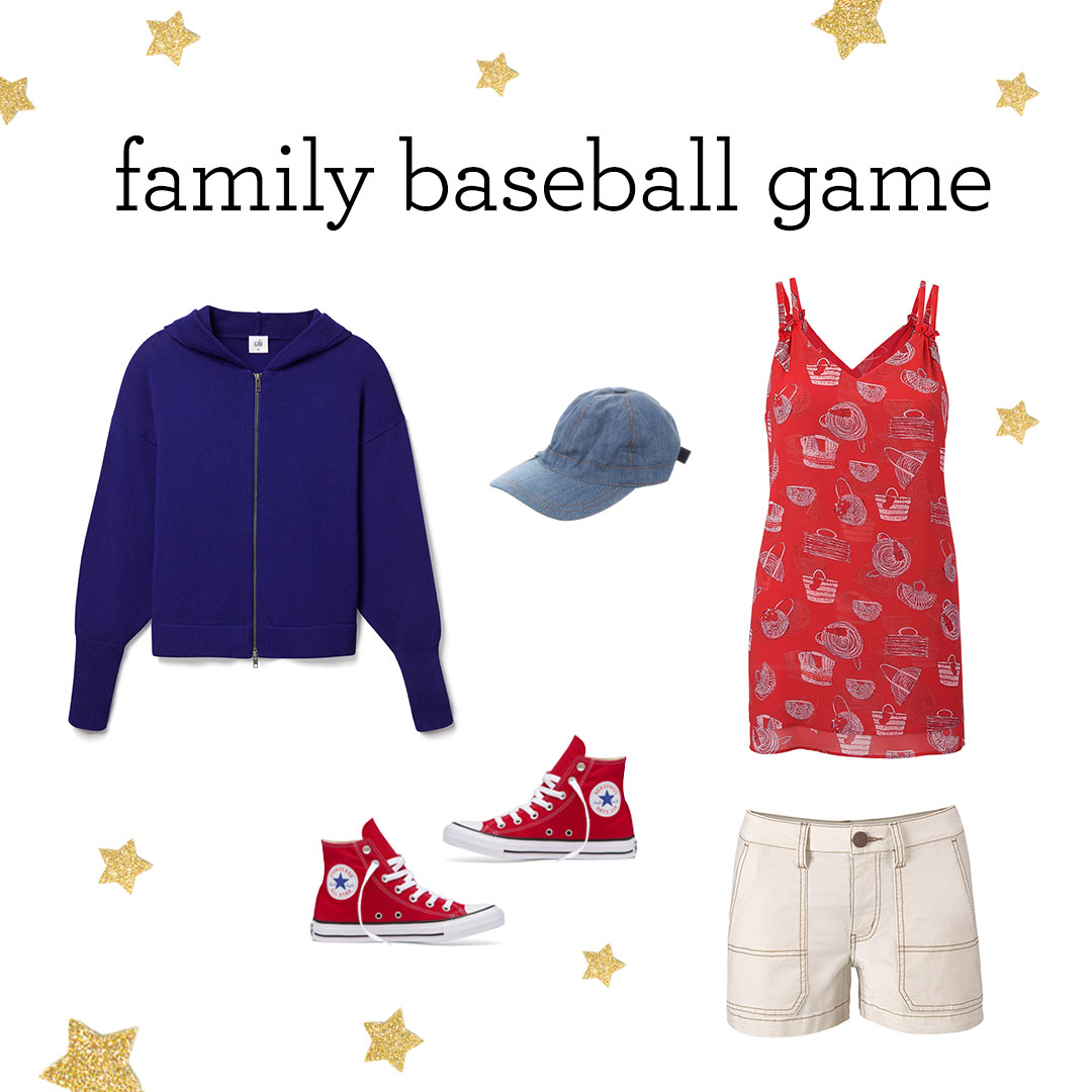 You’ll hit a homerun in this darling outfit, featuring a red cami and white denim shorts. Grab the electric blue Dressed-Up Hoodie for the perfect comfy topper. Wear with a classic pair of red Converse sneakers and a baseball cap, of course. All that’s missing are peanuts and Cracker Jacks!