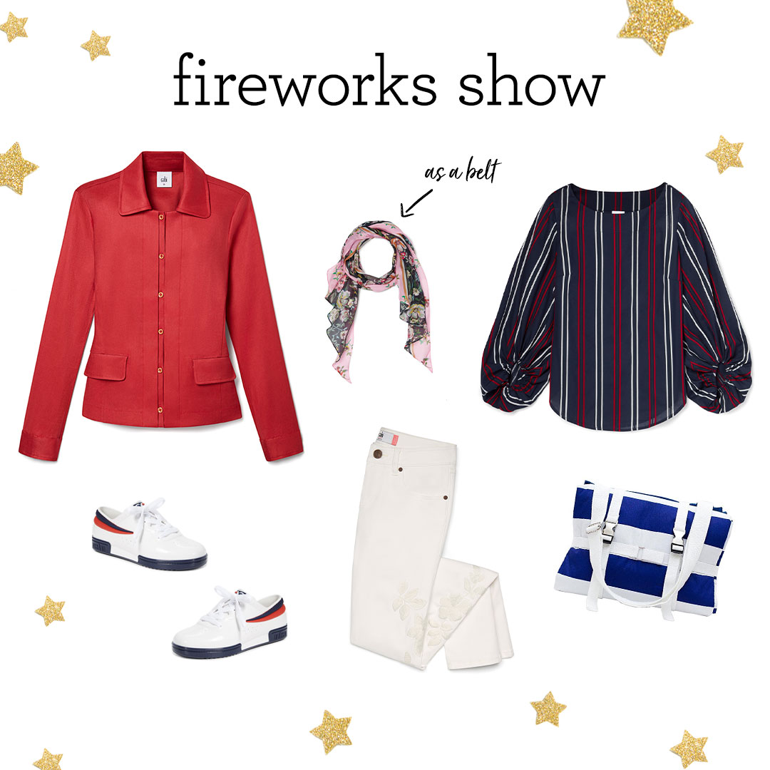 What better way to celebrate Independence Day than with fireworks! You’ll sparkle in this outfit, featuring our Flag Blouse with white denim and a bold red jacket. Accessorize with a belted scarf, comfy shoes, and a cute blanket.