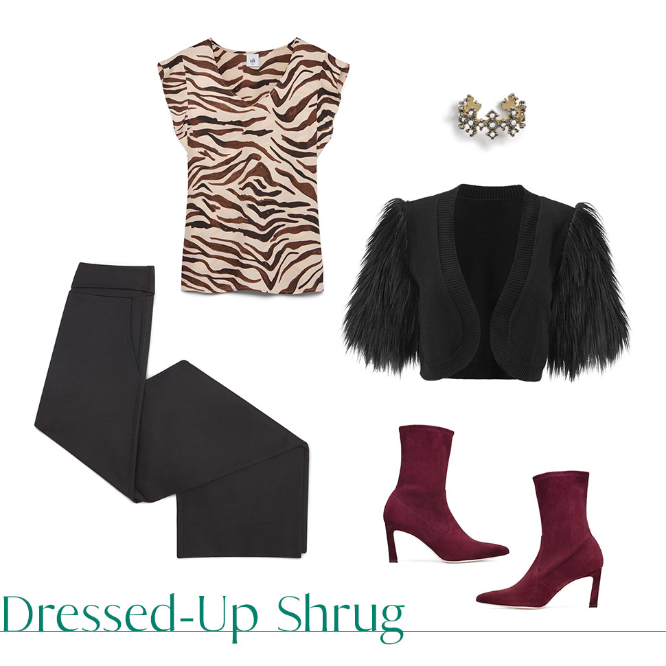 Featured Items: Dressed-Up Shrug, Zebra Top, Chance Wide Leg, Tudor Cuff, Booties