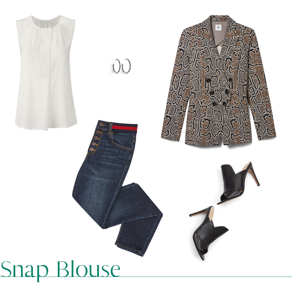 Featured Items: Snap Blouse, Python Blazer, Button Fly Skinny, Jet Hoops, Pumps