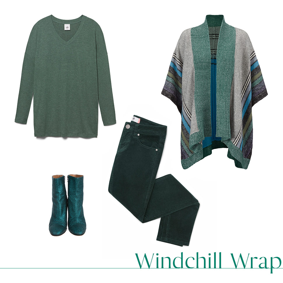Featured Items: Windchill Wrap, Serenity Tee (Heather Pine), Skinny Cord, Boots