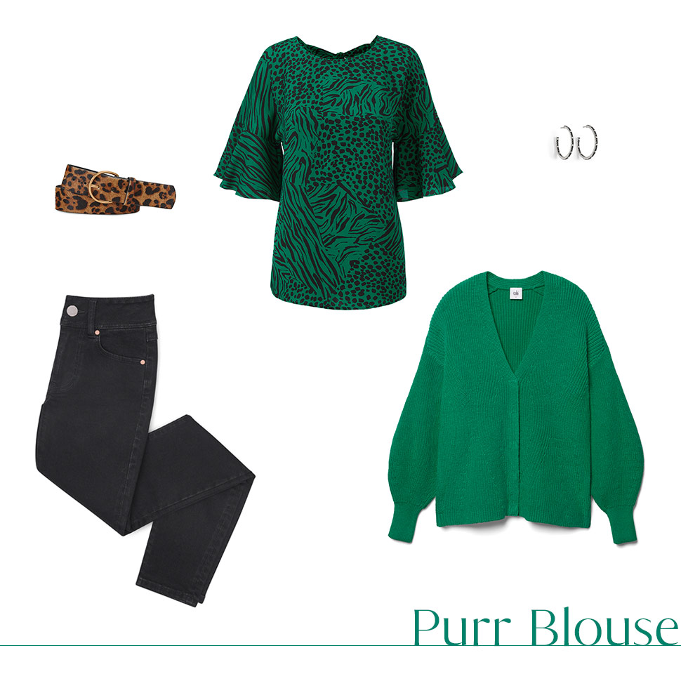 Run with the Gem Tones trend by pairing the emerald Purr Blouse with the Lucky Cardigan. Some black skinny jeans will provide a neutral base. Try a complete tuck of the blouse into the jeans to show off the Beast Belt.
