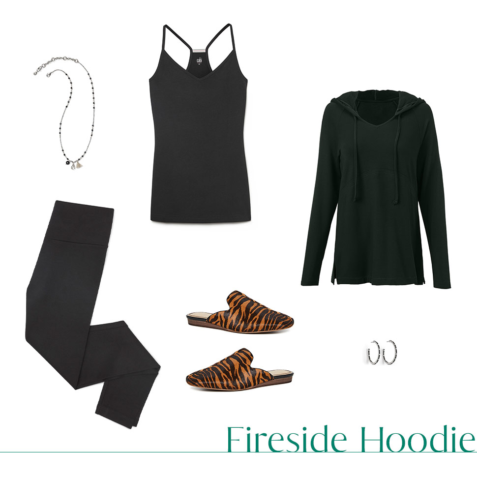 Featured Items: Fireside Hoodie, Pivot Racer Tank, High Legging (Black), Jet Hoops, Jet Necklace, Mules