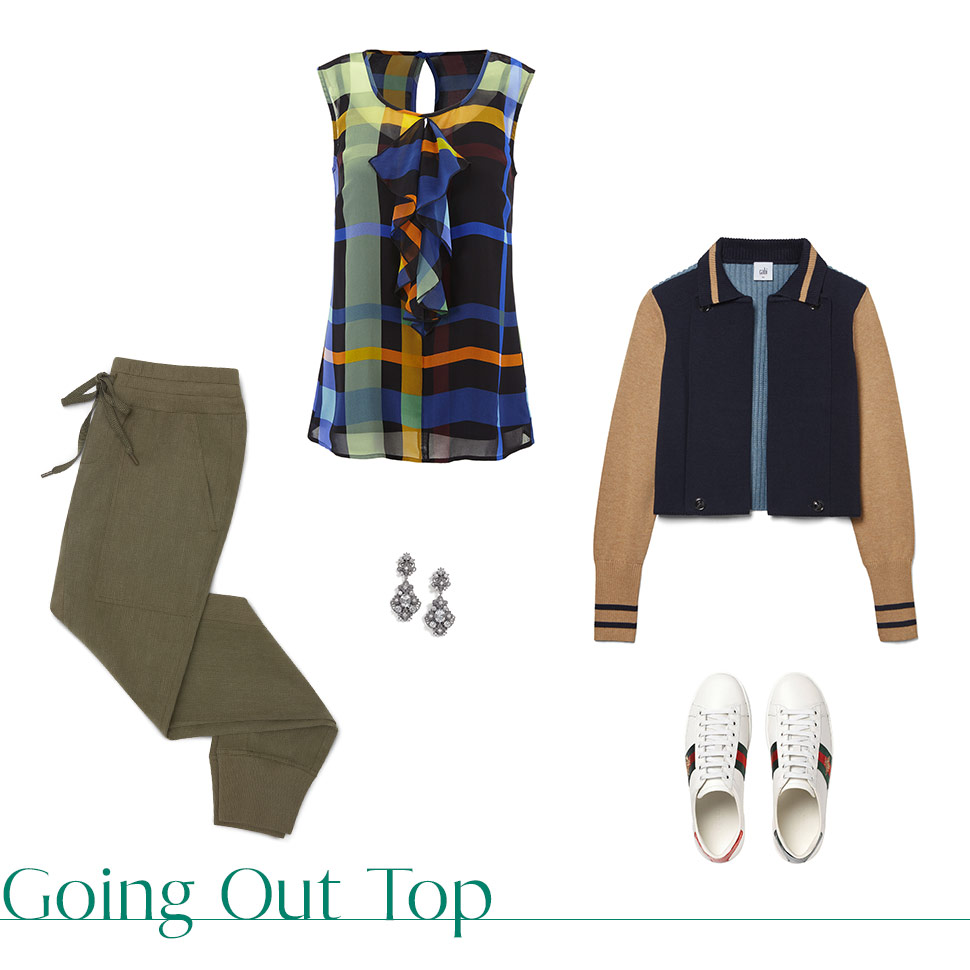 Pair opposites for a surprisingly put together look. Take the printed, chiffon Going Out Top and style it with the relaxed Marathon Jogger. Grab a cardigan and sneakers for the finishing touches.