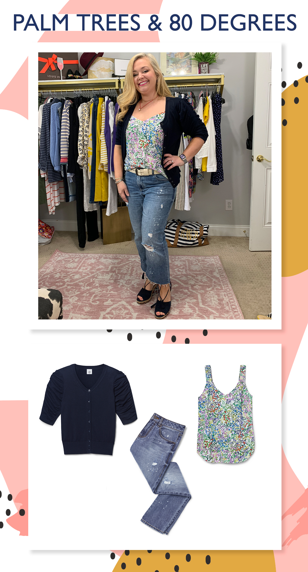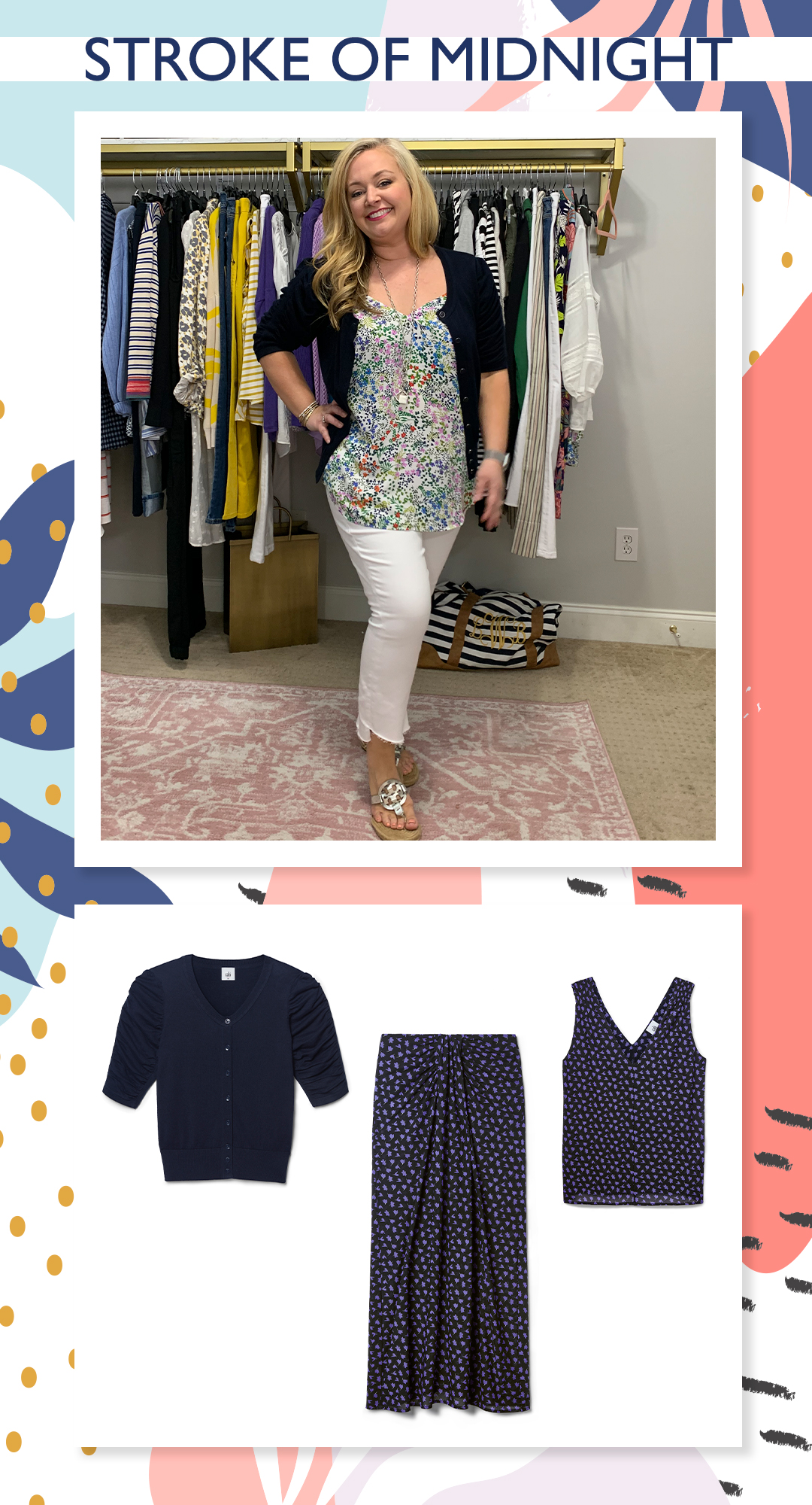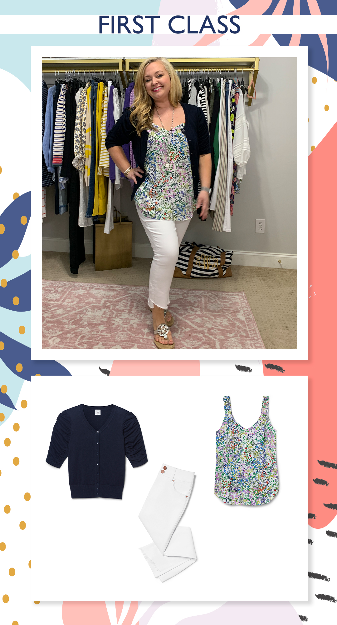 Style Tip: Add a floral blouse for a pop of print against solid colors. It’s the perfect way to spice up a classic navy and white look!