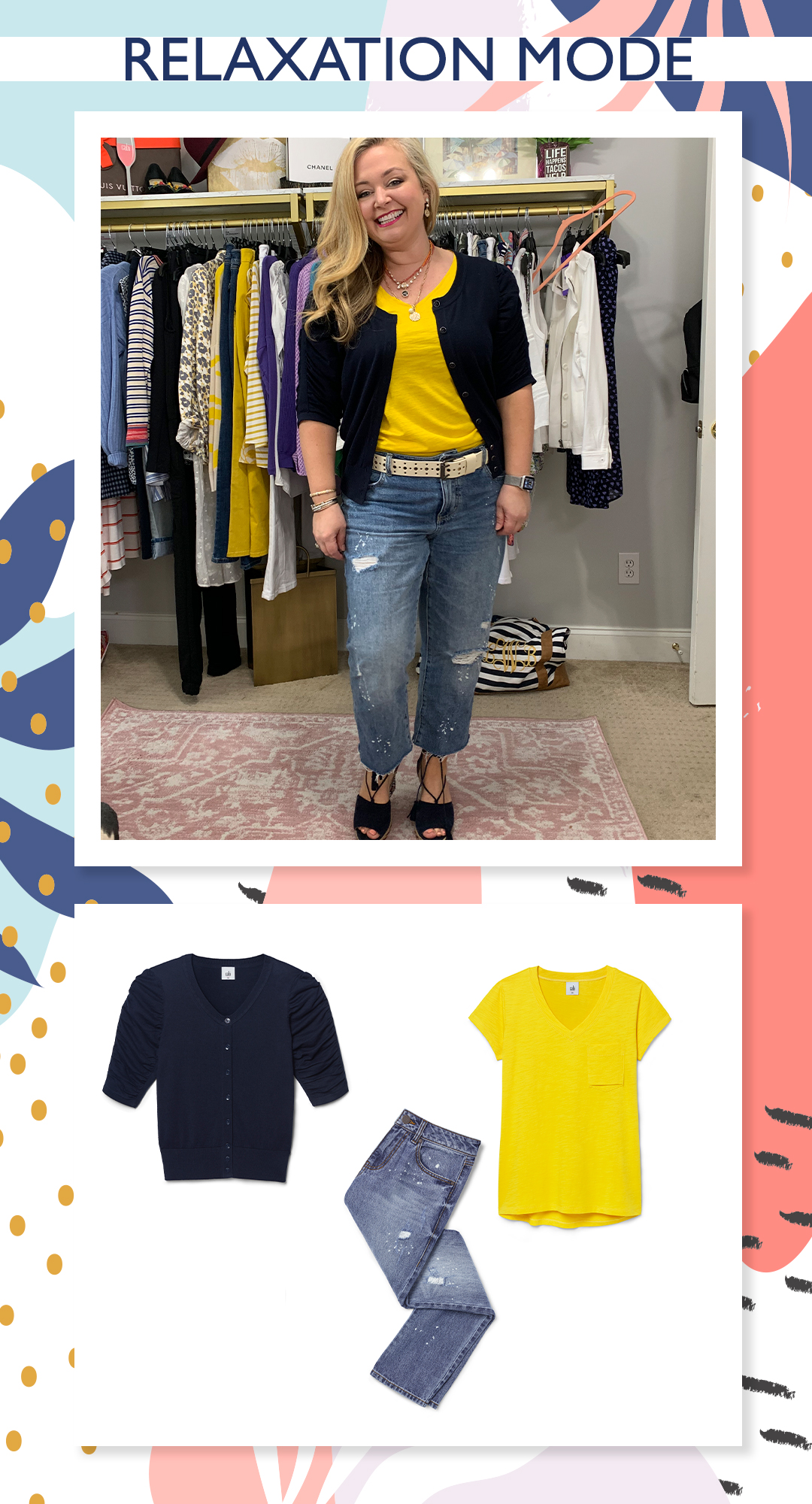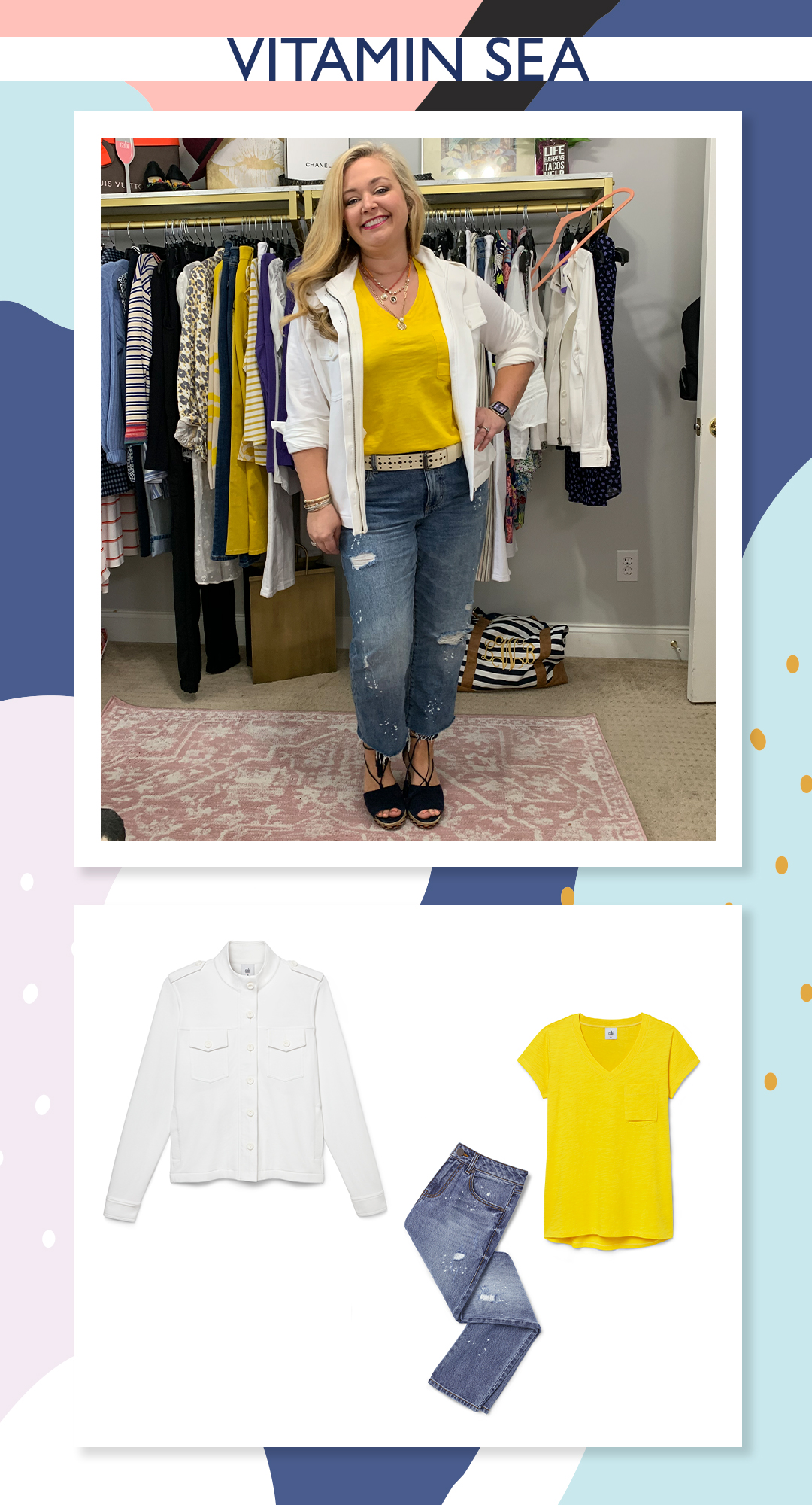 Style Tip: Navy and yellow is a classic summer pairing. Complement this look with white denim.