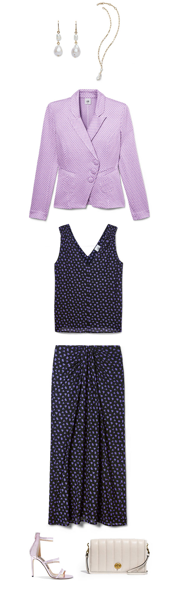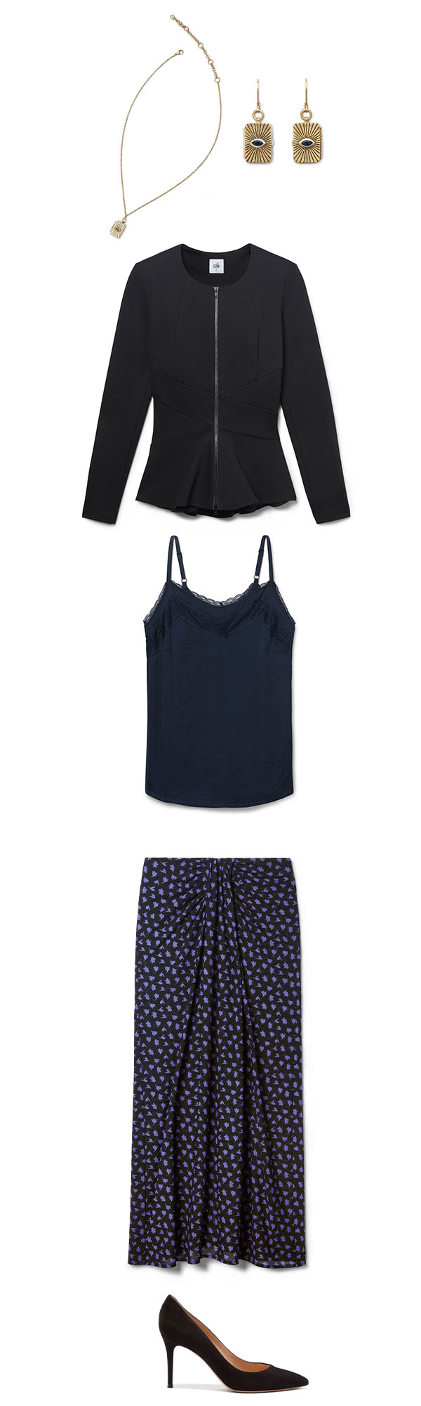 Featured Items: Crisscross Blazer, All-Purpose Cami, Island Skirt, Diary Necklace, Diary Earrings, Pumps