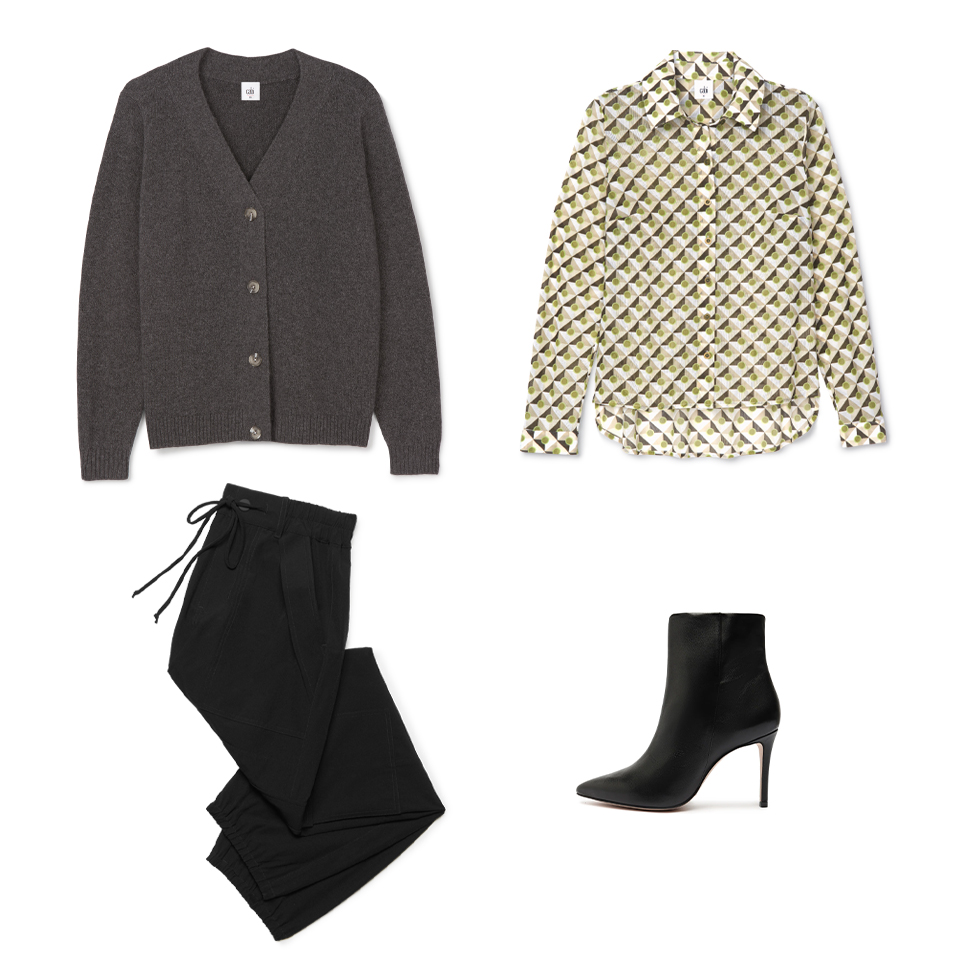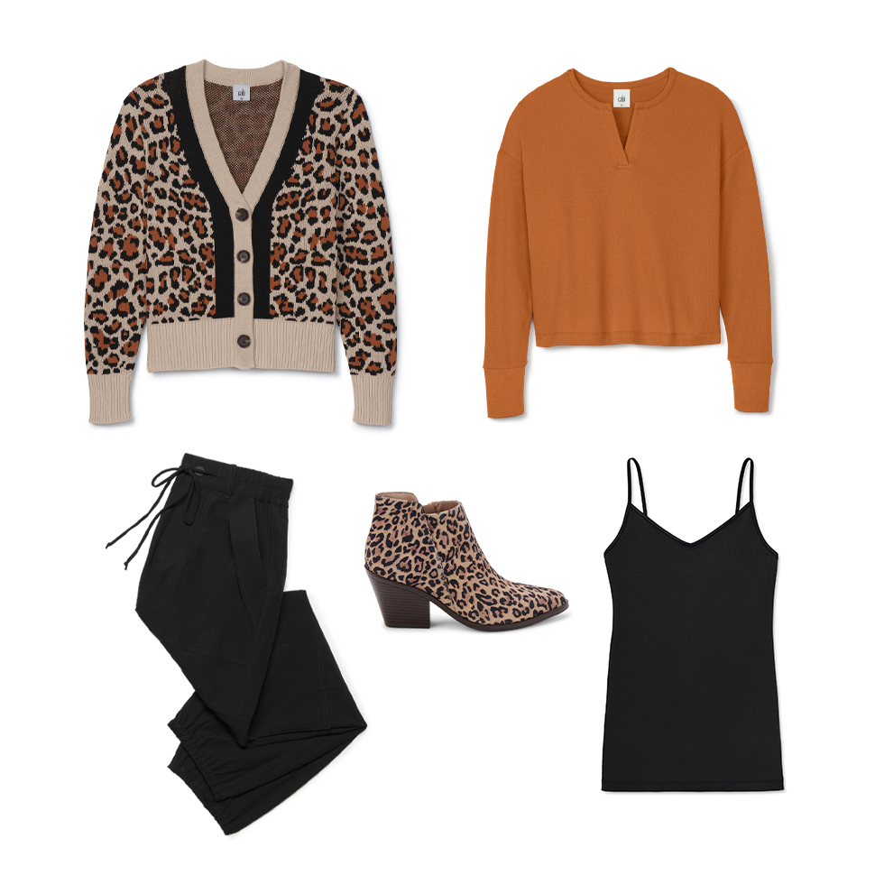 Use the all-black Quantum Cargo as a neutral base—a springboard, if you will—for playing with color and pattern. Try mixing a copper tone back to the retro, skin-print Nine Lives Cardigan.